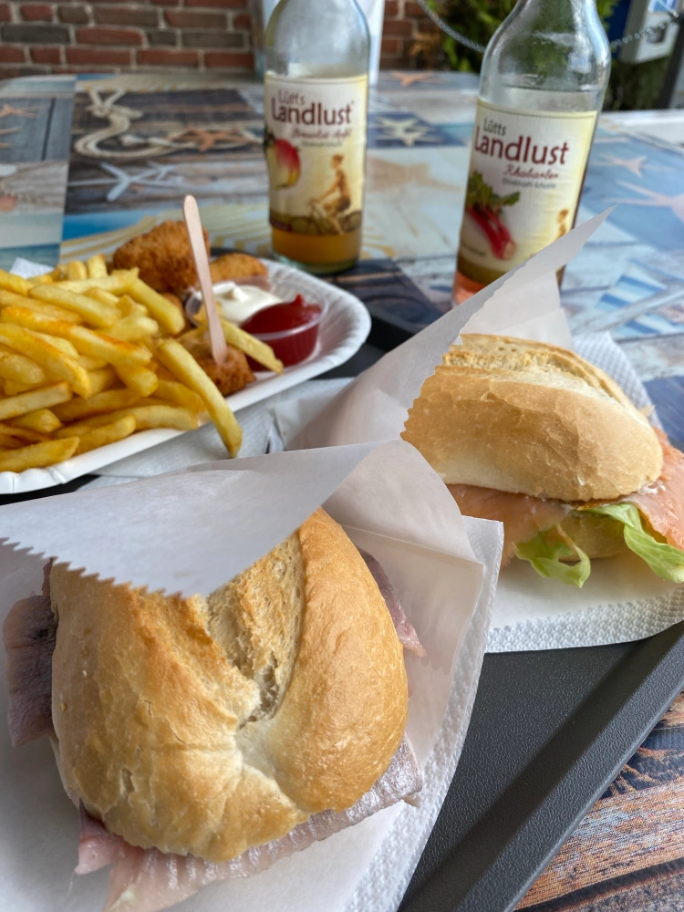 Statt Klischees zu erfüllen oder zu spülen, wandern wir einen guten Kilometer am Strand entlang zu einer kleinen Holzhütte in nordisch anmutendem rot-weiß. Der selbstgebackene Kuchen hier soll ein absoluter Geheimtipp sein.