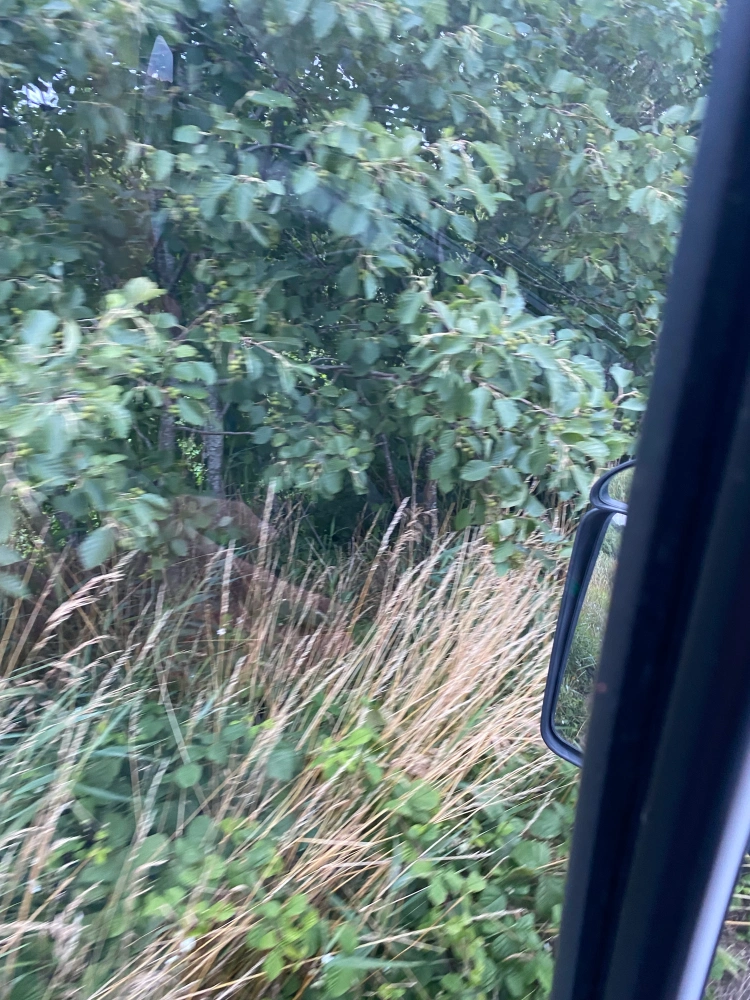 Ich bin also zum zweiten Mal schlagartig hellwach, raffe unseren ganzen überflüssigen Glamping-Schnick-Schnack zusammen, kippe den Rest Kaffee in den Brombeerbusch und sitze 11 Minuten später im Cockpit. Im Gegensatz zu mir ist Walter ausgeruht und heult kraftvoll auf. Wenn jetzt alles glatt läuft, sind wir überpünktlich an der Fähre. Passiert uns sonst auch nur ausgesprochen selten.