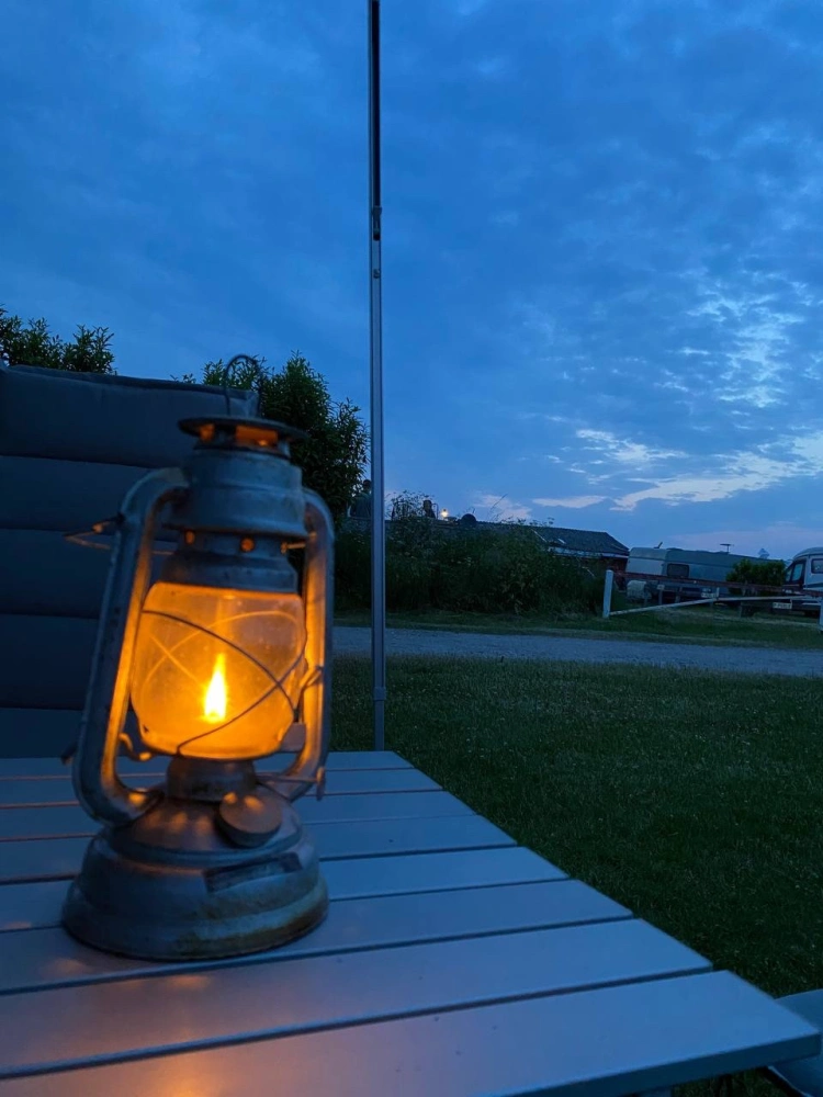 Eine Stunde später ist Walter mittels Auffahrrampen ausgemittelt, die Markise gespannt, Tisch, Stuhl, Grill, Sofa und Petroleumlampe aufgebaut. Der Kühlschrank auf Gasbetrieb umgestellt, der Weinkanister griffbereit platziert, Teller, Gläser, Besteck, Fleisch, Käse, Salat und diverse Saucen stehen bereit.
