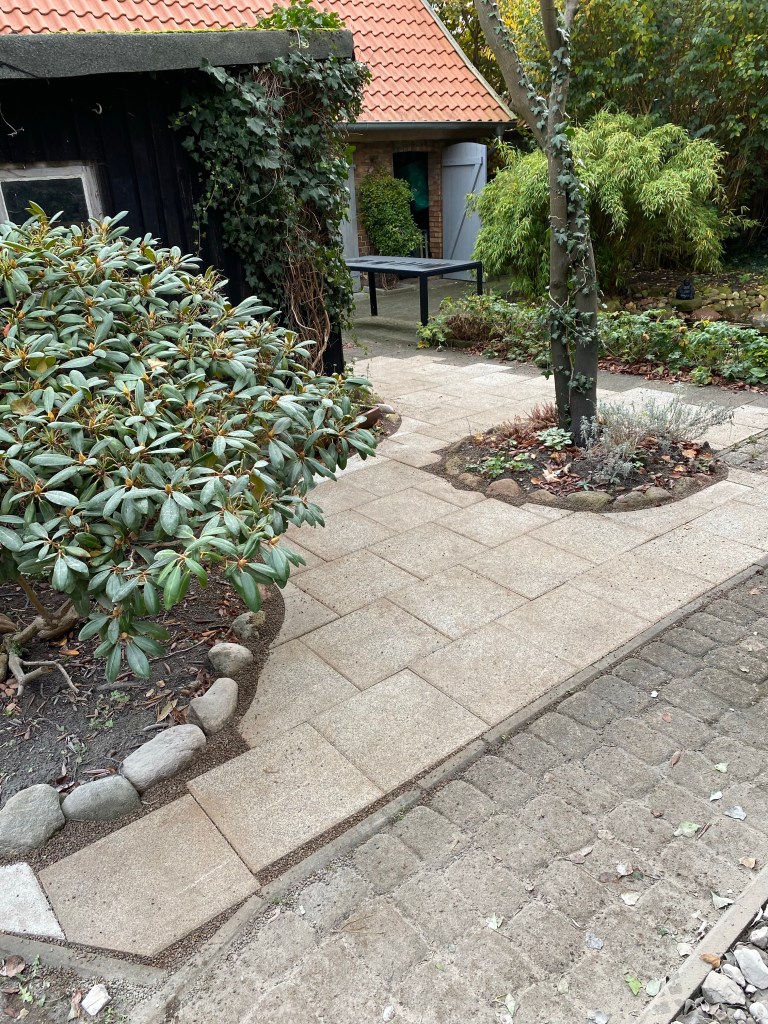 Opa schafft also das Material ran, Björni ruiniert das danebenliegende Beet, seine Kniee und die Geduld aller Nachbarn. Aber am Ende ist die Terrasse fertig und Björni glücklich. Federleicht streicht die geliebte Hausbesetzerin den Punkt von der todo-Liste und sagt „dann können wir ja auch schon los“.