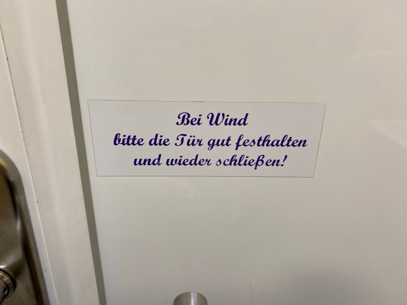 Mit ein paar schnellen Schritten sind wir da und es leuchtet warm und verführerisch von innen. Voller Euphorie hole ich mir eine Beule an der Glasscheibe. Die Tür ist verschlossen und öffnet sich erst um 10:00 – wer lesen kann ist klar im Vorteil.