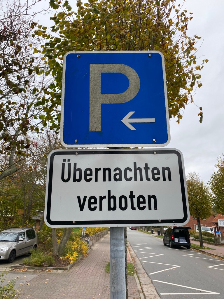 Es ist sensationell: über den Schlick fahren wir bis zur Hochwasserkante und parken quer zum Wasser. Das ist allerdings gerade auf dem Rückzug und etwa 800 Meter weit weg. Egal, es ist ein Traumstellplatz an einem Traumstrand bei Traumwetter! Ach ja – der Platzwart war auch schon hier. „Übernachten verboten“ steht auf über-lebensgroßen Schildern. Was soll’s, wollten wir eh nicht. Wer will schon am Strand …. auf dem Strand, direkt am Wasser? Ach neee – wir jedenfalls nicht.