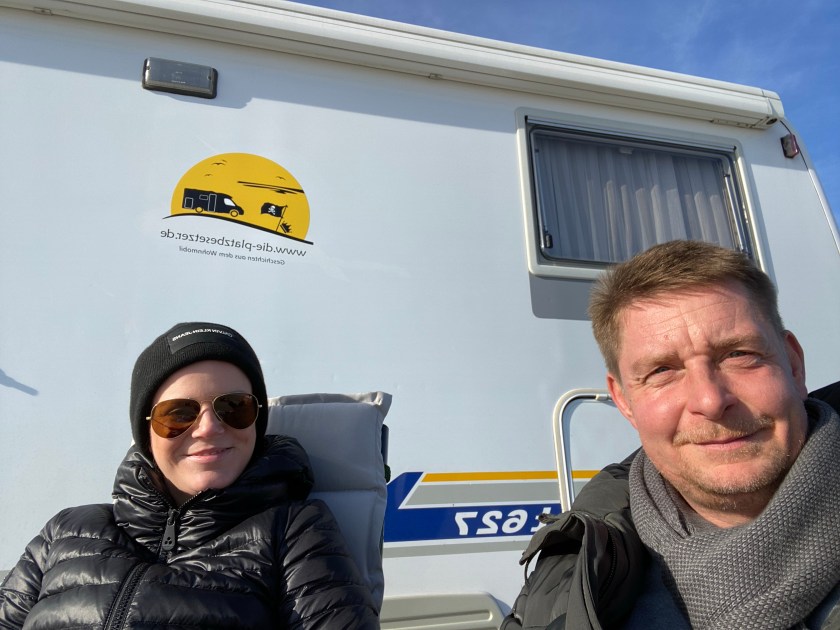Und während wir zufrieden in der Sonne sitzen und den ersten Glimmer des Tages haben, rollt ein WoMo nach dem nächsten auf den Platz. Wir fühlen uns moralisch total überlegen – waren wir doch rechtzeitig hier und haben noch einen Stellplatz ergattert. Außerdem brauchen wir längst nicht mehr soviel Zeit wie der Typ im grünen Van schräg gegenüber, bis wir am Strom hängen, die Stühle draußen haben und auf den Rampen stehen. Außerdem – der steht ja falsch herum. Das weiß man doch, dass hier in Fahrtrichtung ….. Moment mal! Lästern wir etwa gerade?
