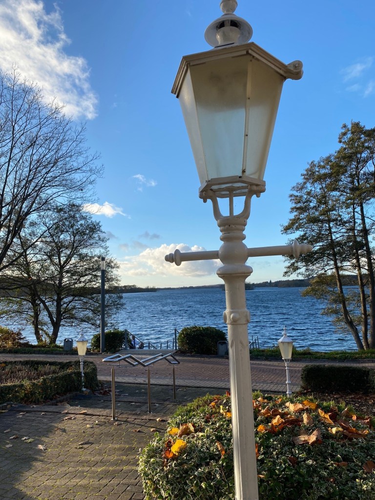 Ist es tatsächlich! Die Anfahrt zwischen den Seen mit einer immer noch weihnachtlich beleuchteten Stadt im Hintergrund ist ganz bezaubernd. Zielsicher finden wir einen Parkplatz direkt am Ufer, neben dem örtlichen „Hallenbad“. Ja, das heißt hier wirklich noch so.
