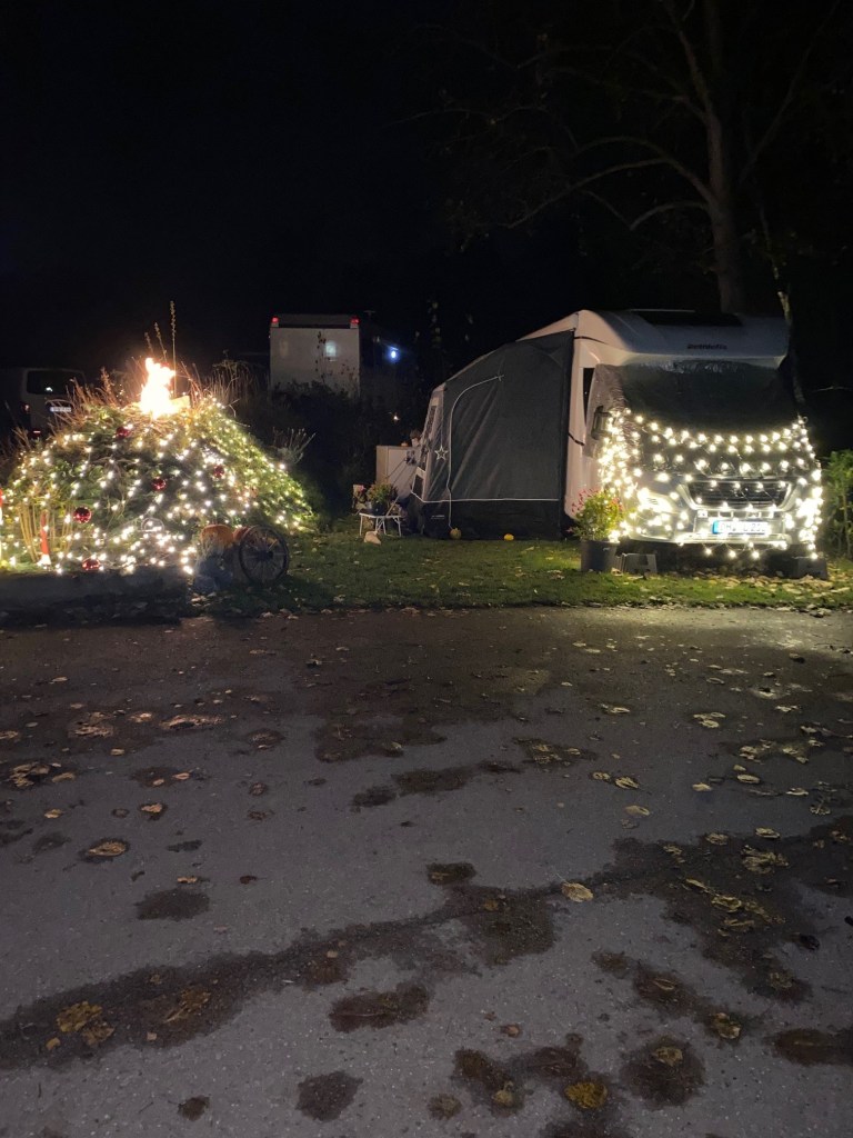 Und während ich gestern Abend draußen vor der Tür stehe und rauche, sehe ich alles doppelt und dreifach. Hmm, soviel Rotwein war es doch noch gar nicht…. In der Reihe vor uns flimmert es durch die Scheiben um die Wette. Drei Wohnmobile – ein Vollintegrierter, ein Alkoven und ein Offroad. Und bei allen drei flimmert dasselbe Bild über den Flatscreen, der größer ist als unsere Tischplatte.