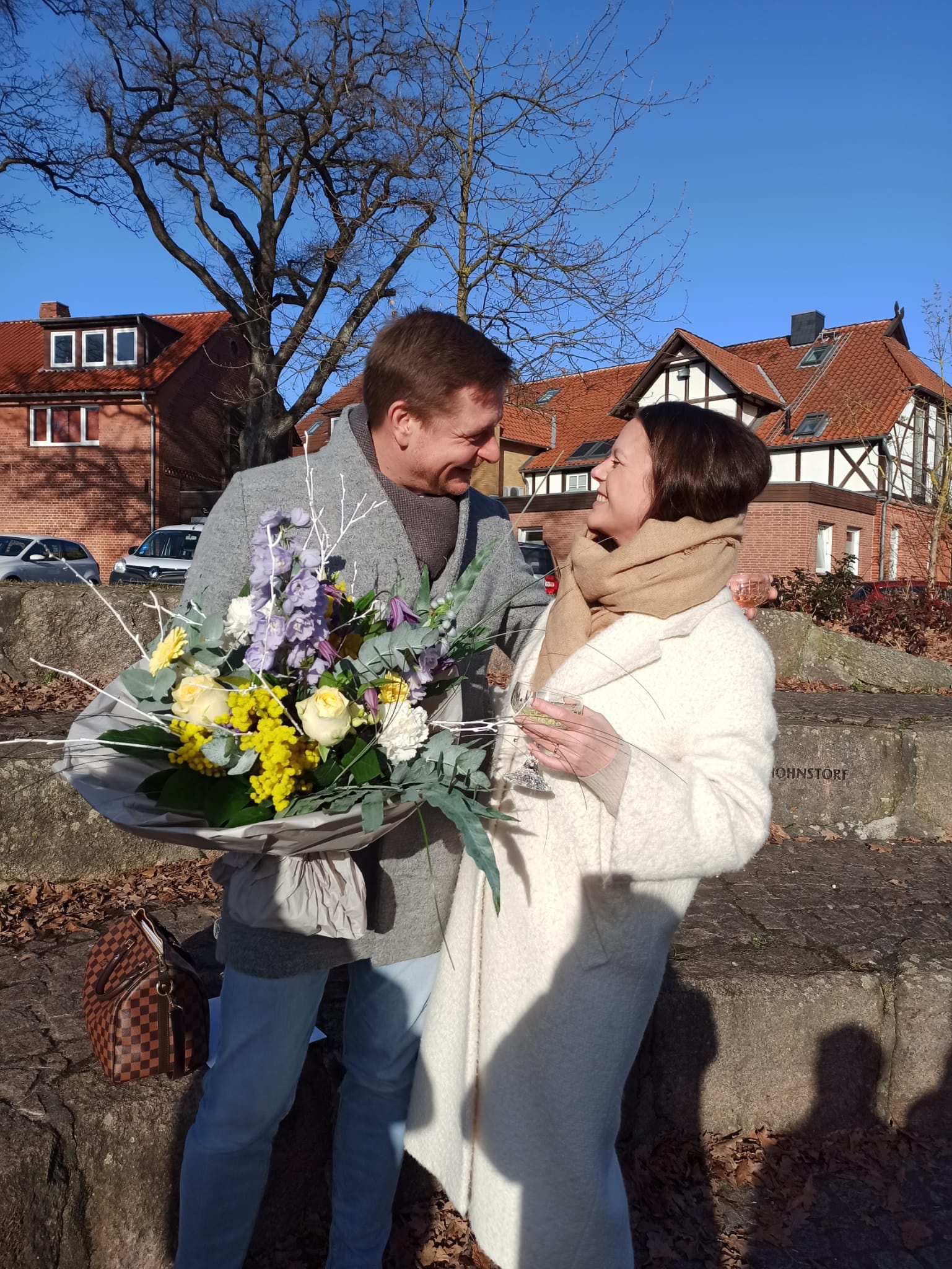 „Eigentlich“ wollten wir diesen Moment und diesen Tag ganz für uns alleine haben. Trotzdem hören wir ein Rufen und Winken, als wir vor die Tür in den schönsten Sonnenschein treten. Ein wenig Familie, engste Freunde und jede Menge Sprutzel. Herrlich!