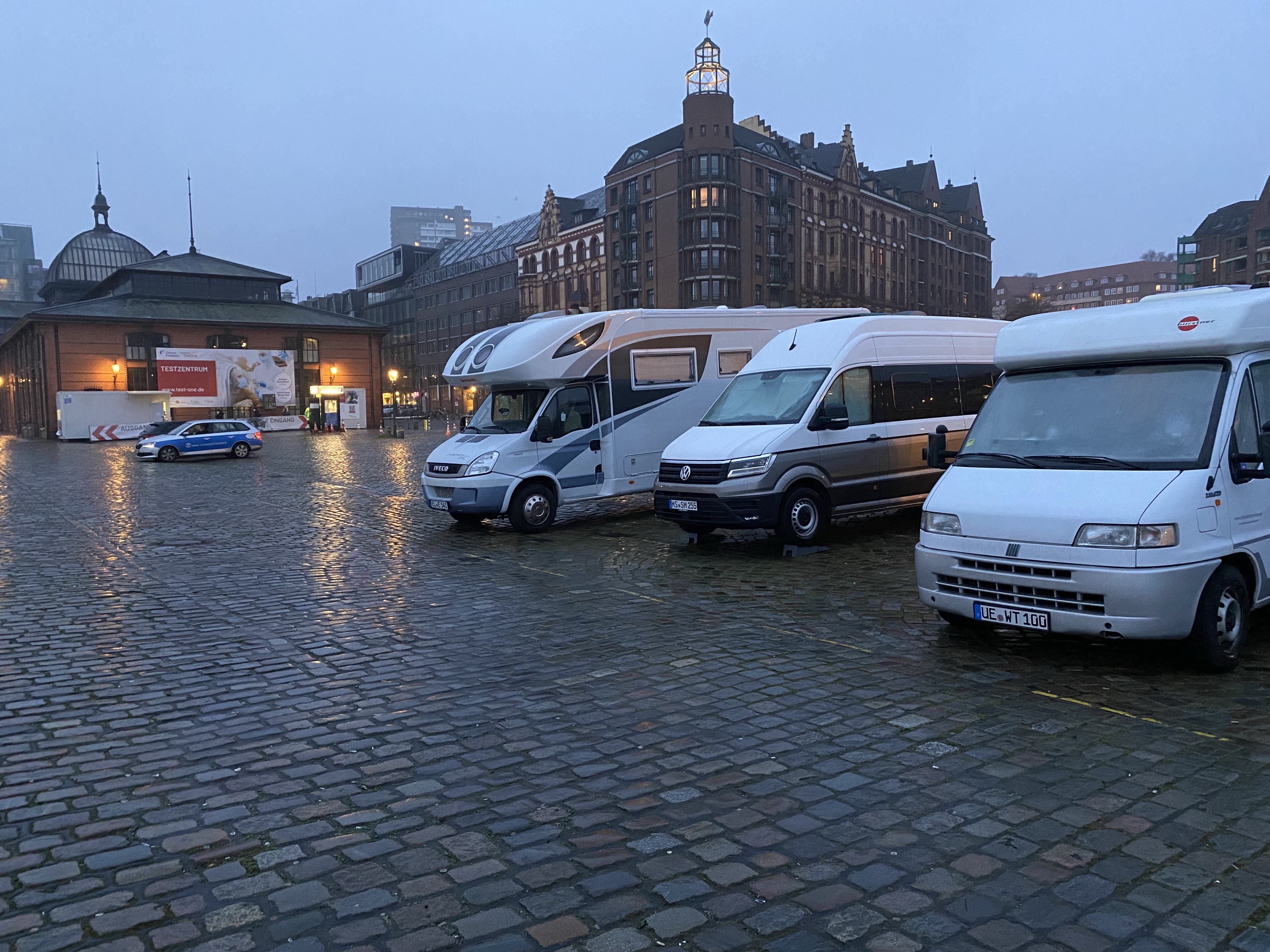 Schon immer wollten wir über Nacht mal am Fischmarkt stehen. Gesagt, getan. Die knapp 200m zurück findet Walter alleine, mit unserer Hilfe sogar einen freien Platz. Mit Blick auf den geschäftigen Hafen schlafen wir zufrieden ein.