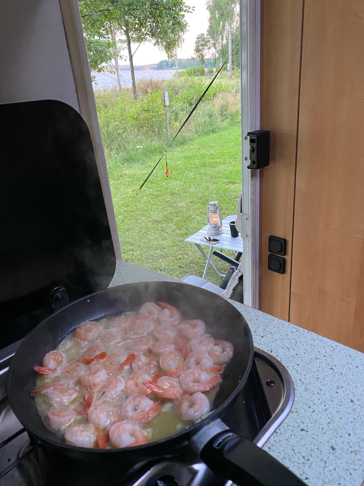 Naja, da das Camperleben karg und entbehrungsreich ist, holen wir die frisch eingekauften Garnelen aus dem Kühlschrank, schenken uns Wein und der Pfanne Knoblauch ein und genießen dieses armselige Essen pünktlich zum Sonnenuntergang.