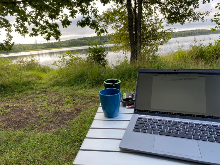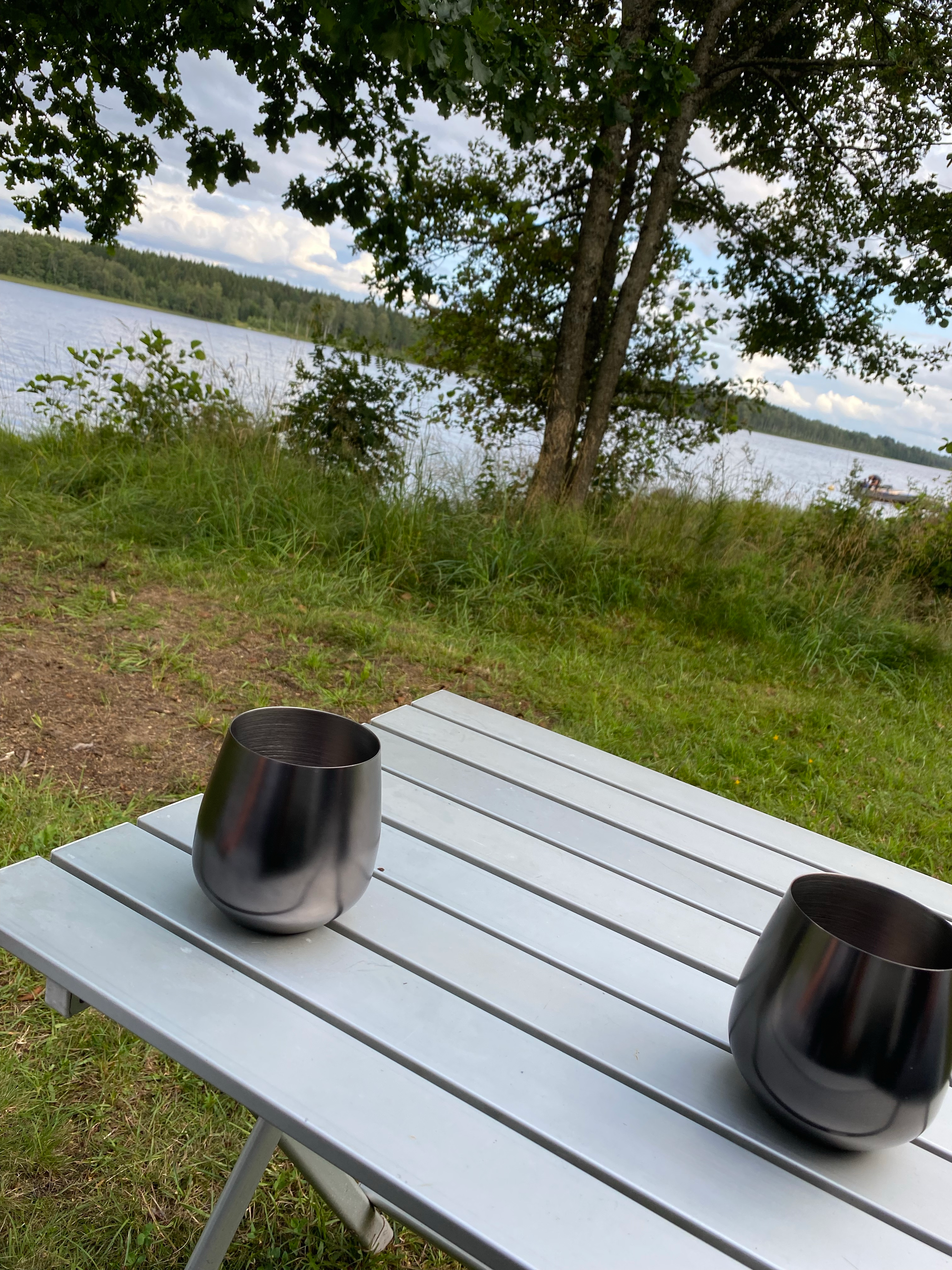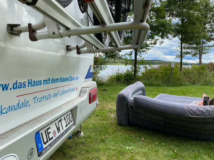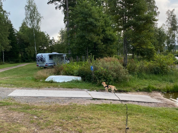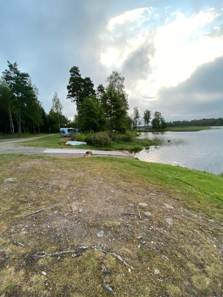 Nach weiteren zwei Stunden warten, mit Karl gehen, warten und schweigen ergattern wir tatsächlich den besten Platz vor Ort. Wir haben ausreichend Abstand zu den anderen Campern und zu zwei Seiten einen freien Blick auf die Ostsee …. ähm den Vännern-See. Neben uns ein riesiges Wohnmobil, aus dessen Fenster drei große Hunde schauen.