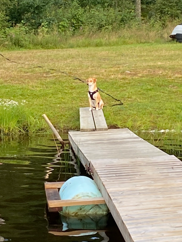 Als ich mich kurz umdrehe, sitzt Karl am Ufer, genervt, gelangweilt und irritiert. Auf den Steg hat er sich nicht getraut, so sehr ich ihn auch ermuntert habe.