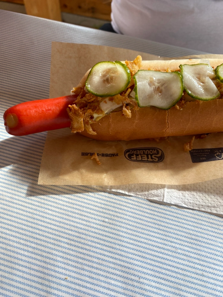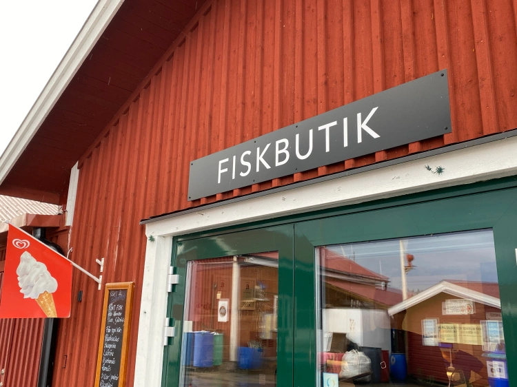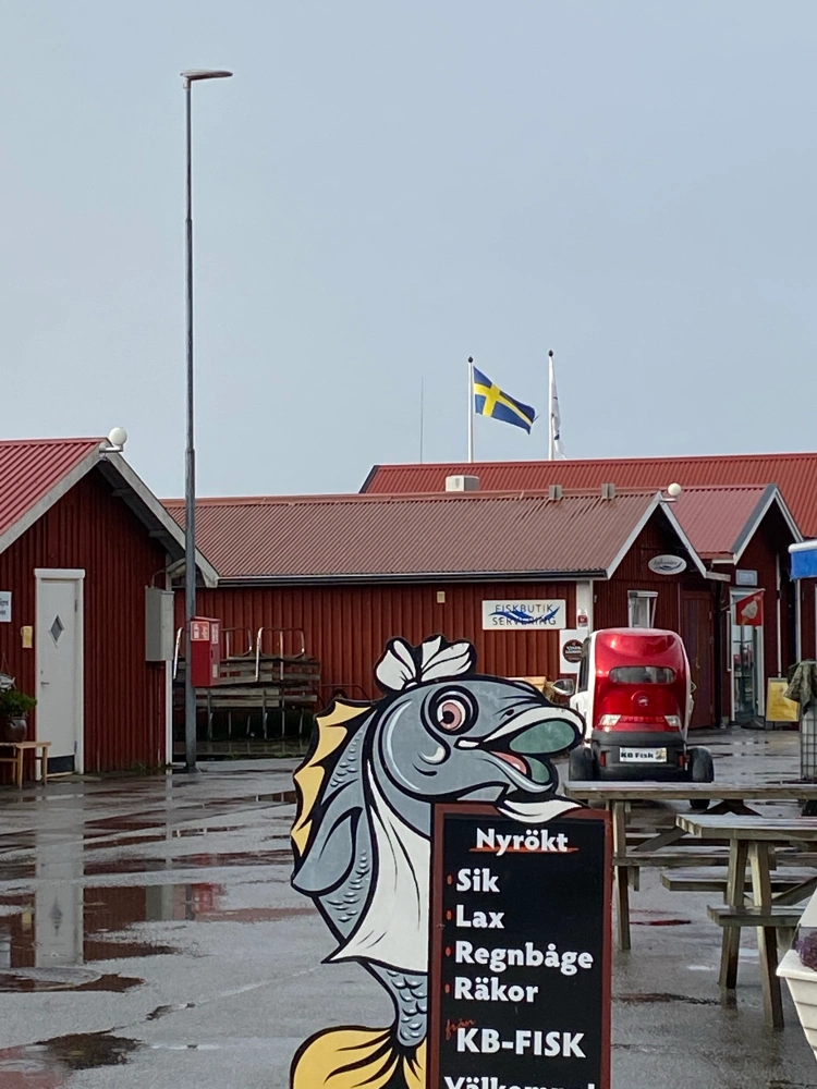 Wir schlendern durch den Hafen und sind ganz entzückt. Karlchen schnuppert voran, geradewegs zu einer kleinen Hütte mit einem vielversprechenden Schild vor der Tür. Ich kann zwar kein Schwedisch, aber der verliebte Blick eines hungrigen Kenners entdeckt sein nächstes Date auch ohne Worte.