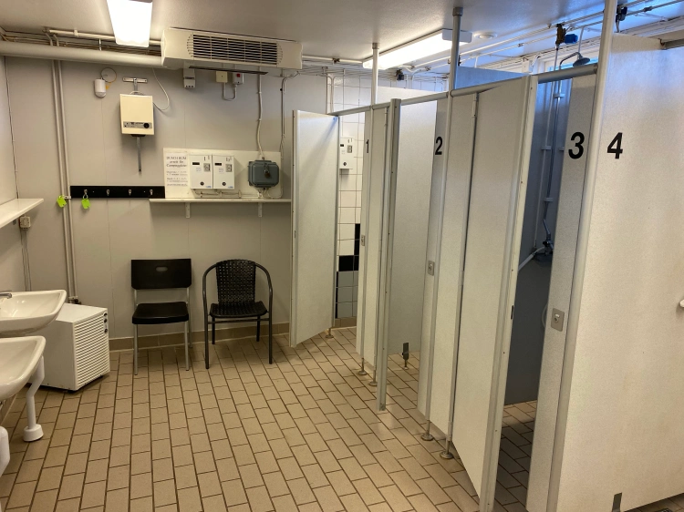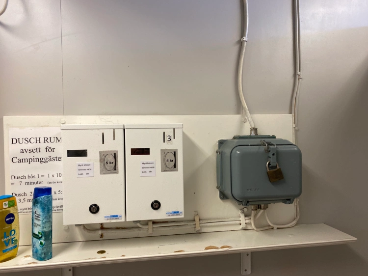 Habt Ihr schon mal versucht, im Nieselregen zu duschen? Da holst Du dir eine Erkältung, aber nicht den Dreck vom Körper. Für eine 5 Kronenmünze gibt es exakt 3,5 Minuten und 1,5 Liter lauwarmes Wasser. Dafür musst Du aber erst die Münze in den passenden Automaten werfen und möglichst schnell zu der (deiner) Kabine zu laufen. Nackt. Auf alten Fliesen.