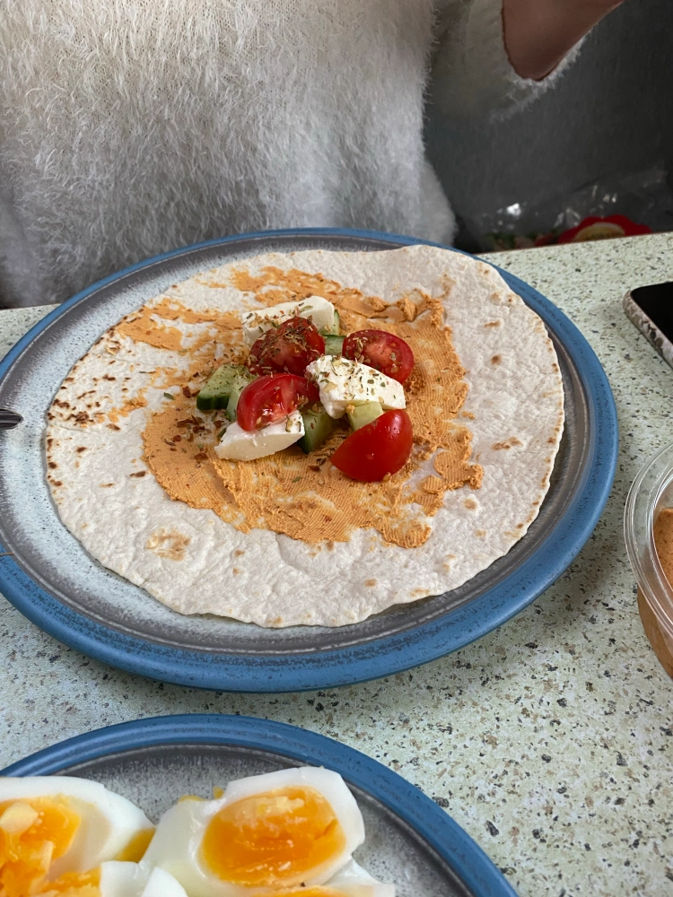 Wir tasten uns kurz unseren Bauch ab. Nein, keine Schmerzen. Der Blinddarm bleibt drin. Dafür knurrt es beim Drücken bedrohlich, Zeit für ein üppiges Abendessen aus allem, was wir noch so haben. Und ebenjenes stapeln wir kreuz und quer auf unseren kleinen Klapptisch, so dass es an den Seiten fast herunter fällt. Wir genießen den Querfraß, während nebenan gerade ein Kamillentee in der Porzellankanne aufgegossen wird.