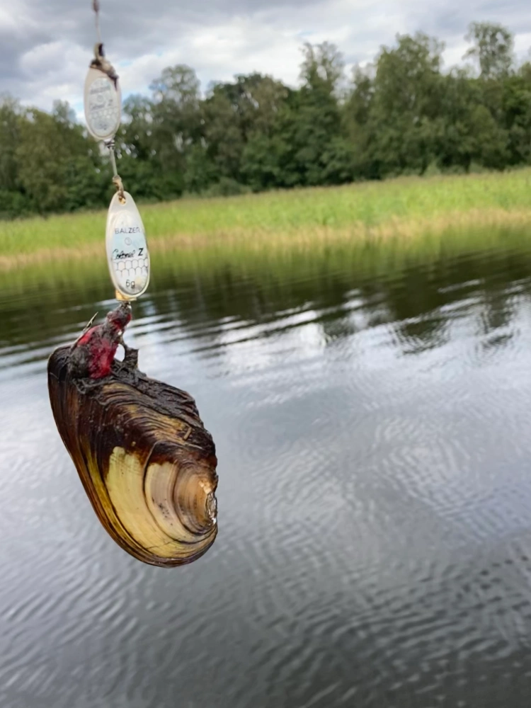 Stop – das stimmt so nicht ganz. Bei einem meiner Versuche im Trüben zu fischen, hat sich eine wunderschöne Muschel am Haken verfangen. Und da ich für die schönen Dinge des Lebens sehr viel übrig habe, freue ich mich darüber, werfe sie zurück ins Wasser und fahre zufrieden an Land. Ein ganz klein wenig mag meine Zufriedenheit trotz Anglerpech auch damit zusammenhängen, dass ich weiß, was im Kühlschrank liegt: ein riesiges Steak, Maiskolben und andere, schwedische Leckereien.