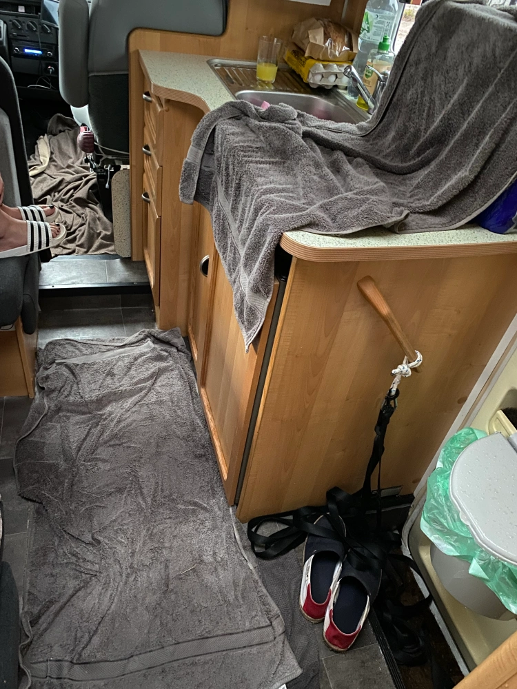 Es ist der Regen – oder können Wohnmobile auch von innen weinen? Ich stehe mit den Füßen im Wasser, als ich die Tür endlich aufhabe. Das ist die perfekte Gelegenheit, endlich auch unsere Handtuchvorräte drastisch zu reduzieren. Fühlt sich ein wenig an wie in einem Sumpfgebiet, als ich die geliebte Hausbesetzerin und Karlchen an der Bushaltestelle abhole.
