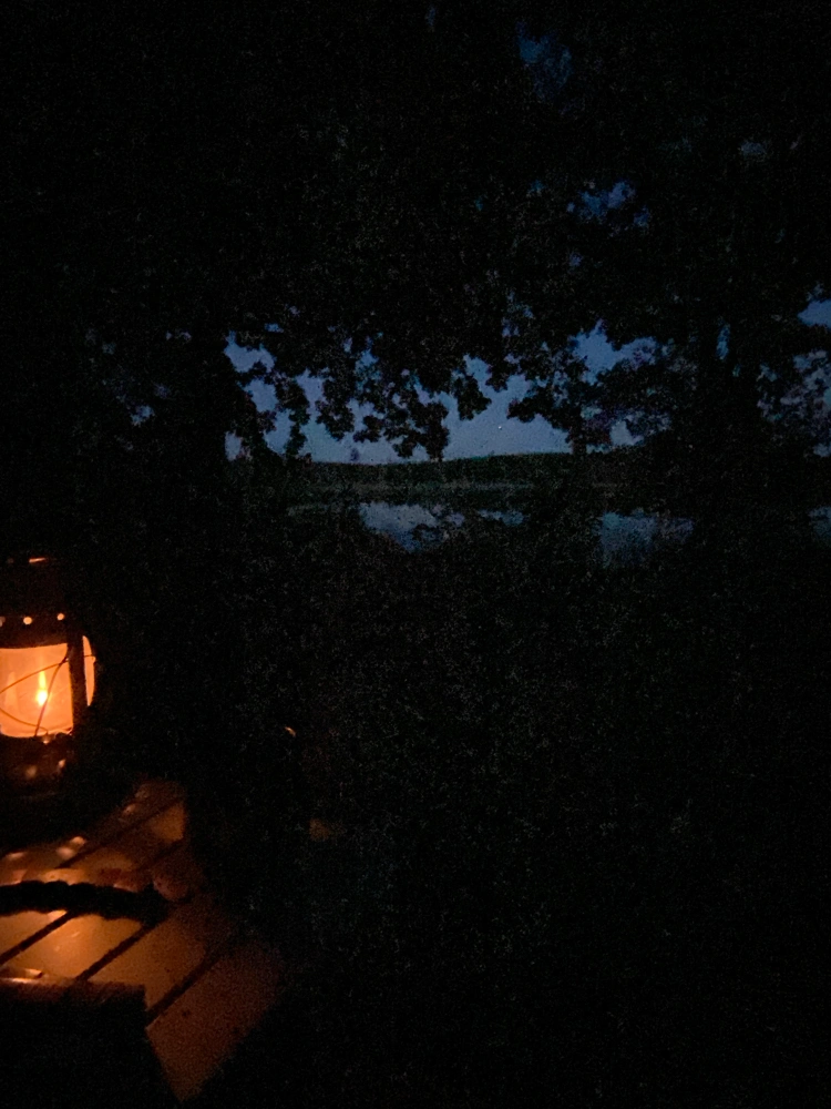 Der Platz hat eine Feuerstelle, zwei urige Boote liegen im Schilf und es ist gerade so viel Platz, dass Walter sein neues Kunststück – auf der Stelle zu wenden – unter Beweis stellen könnte. Die Sonne macht sich schon bereit, kunstvoll hinter den Bäumen am anderen Ufer des Sees zu versinken.