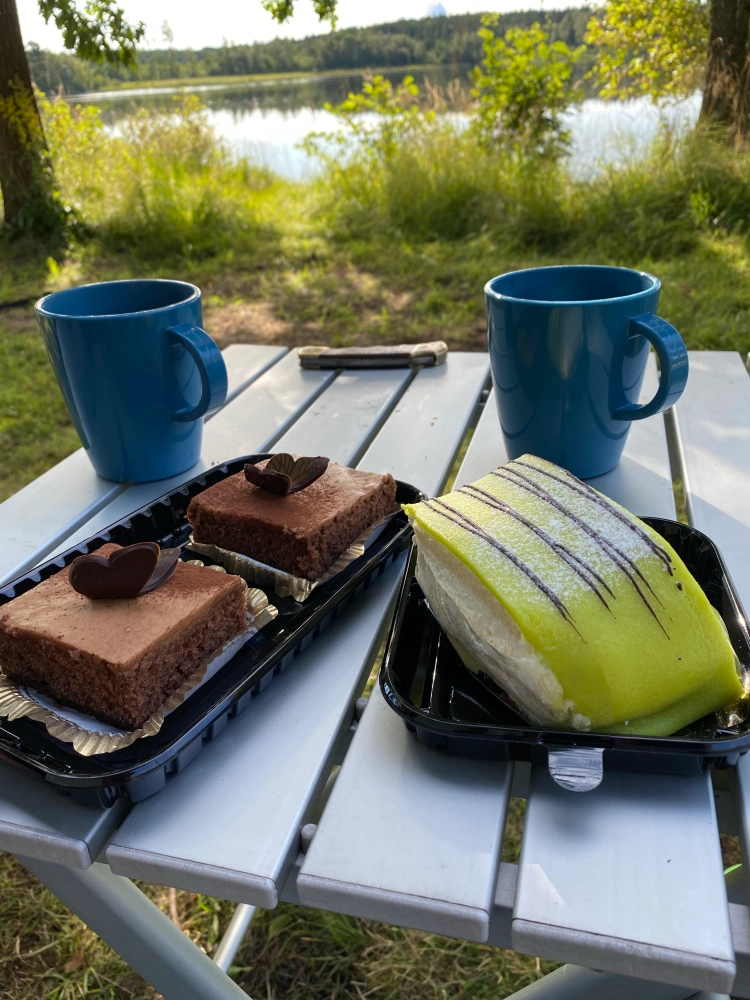 Ich packe zusammen, mache mir noch einen guten Kaffee und frühstücke in der Sonne. Heute ist ein ganz besonderer Tag und deshalb ist es nicht unhöflich, wenn ich schon mal anfange und die geliebte Reiseleitung weiter schlafen lasse. Außerdem gibt es Torte zum Frühstück. Da bin ich mir gar nicht sicher, ob … naja, egal.